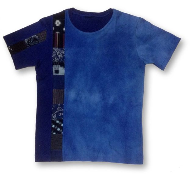 このところ、藍染めのTシャツを作るのが続いていたので、いつものごとく、ハギレが余ってたまってきました。ところが、どれもな中途半端な大きさばかりで、つなぎ合わせても一着のTシャツを作ることすらできません。そこで、これまたハギレばかりとなった古布も使ってTシャツを作ってみました。
