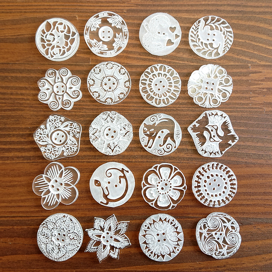 これは草木染工房ひとつ屋がオリジナル・アイテムとして作った、その名も「ノスタルジックなボタン」。それは、和でも洋でもなく、でも!どこか懐かしいデザインで、草木染にも合うように考えました。どれも透明のアクリルを加工したもので、くぼんだ部分にレジンを流し込むと、まるで七宝焼きのような雰囲気のボタンになります。お気に入りの衣服やバッグにアレンジしたり、ハンドメイド作品のワンポイントにしたりと、さまざまな作品で、あなたらしいコーディネートを楽しんでください!