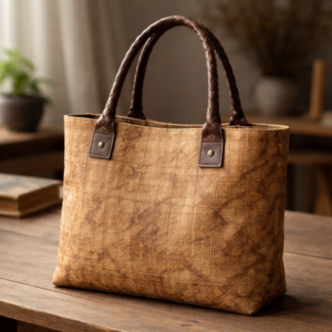 桑の繊維を縦横に並べて圧縮し、揉んで、柿渋で染める(塗る)というもの。伊勢型紙に使われる渋紙をはじめ、揉和紙やパピルスの製作工程を参考にし、頭の中では、すでにバッグの折り目や、持ち手の位置まで浮かんでいます。