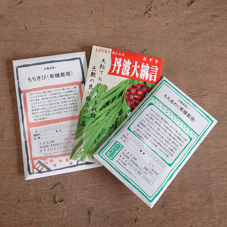 で早速! 先日の米に続き、今日は「もちきび」と「もちあわ」、そして「大納言小豆」のタネを播きました!