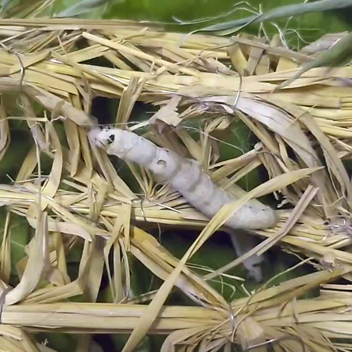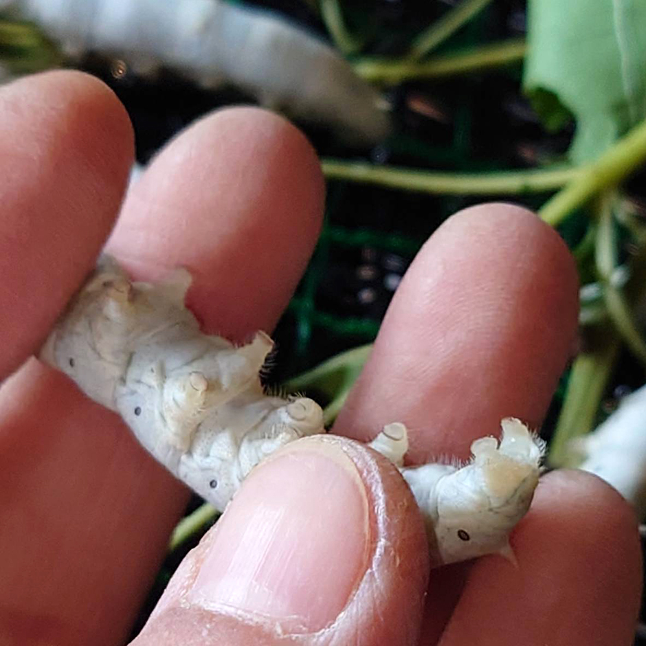 ▼ 27日目。最後の網掛けと「除沙」の日。蚕の脚先が少し透けてきた。いよいよ、繭(まゆ)づくりが始まる。
