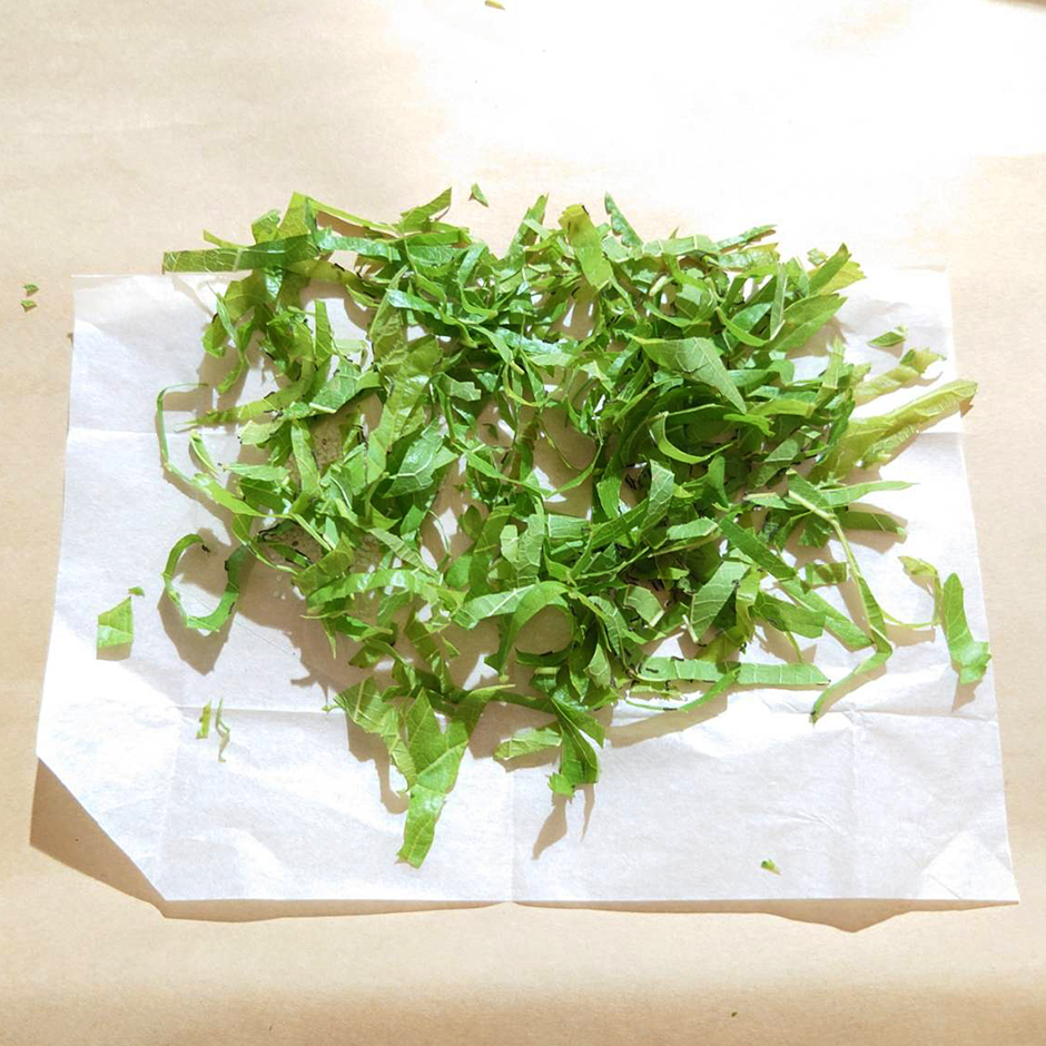 ▼ 下に落ちた食べ残しや糞に蚕が紛れていないかを丁寧に確認。死んでしまった蚕がいれば、ウイルスなどの病原菌を広げないために石灰の中に入れて処分する。
