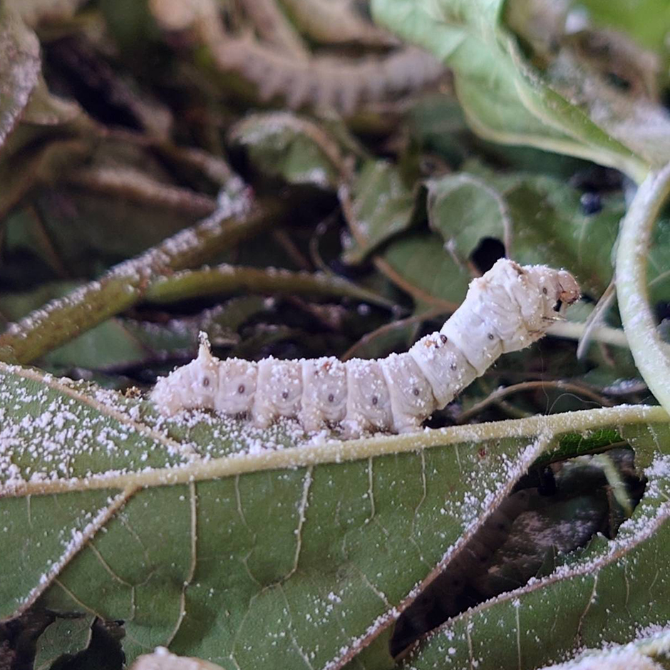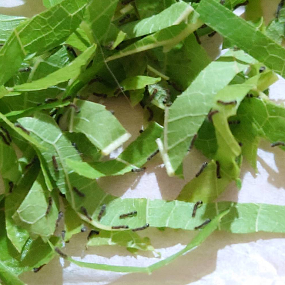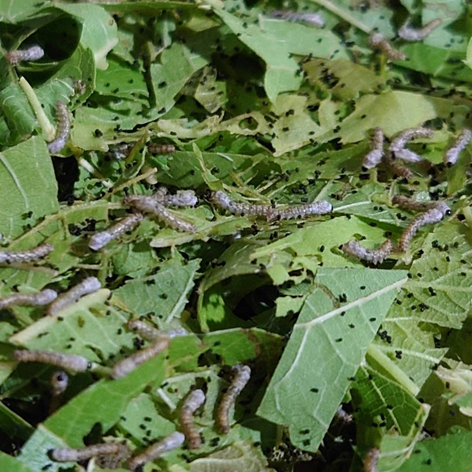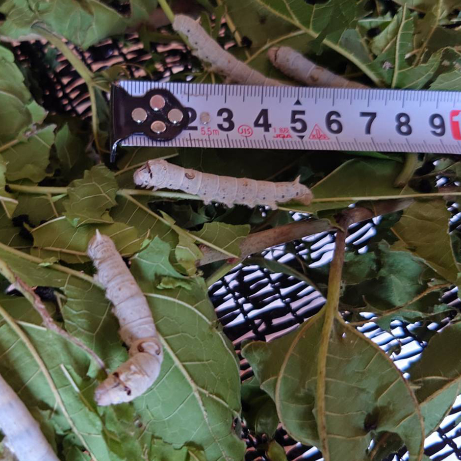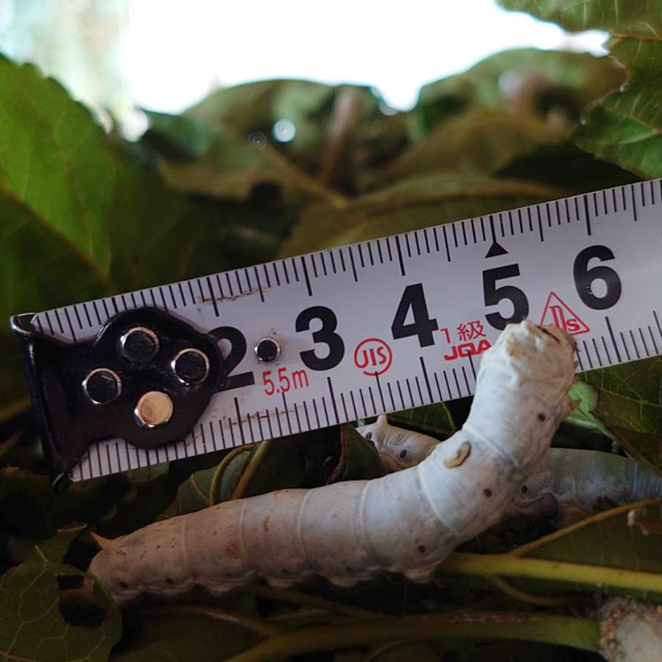 昨夜は激しい雨が降りました。猛暑が続いていたので心配していましたが、雨で気温が少し下がったので、蚕たちの食欲が旺盛です。豪雨のなかで桑を摘んだかいがあったというものです(笑)。最近は、24時間で1cmほど大きくなり、順調に成長しています。今日が4令の4日目になるので、そろそろ次の眠(脱皮準備)に入るころだろうと気にしながら給桑しています。というのも、食べ残しがあると不衛生になるからです。蚕の生長を見ているのが楽しくて仕方ありません!