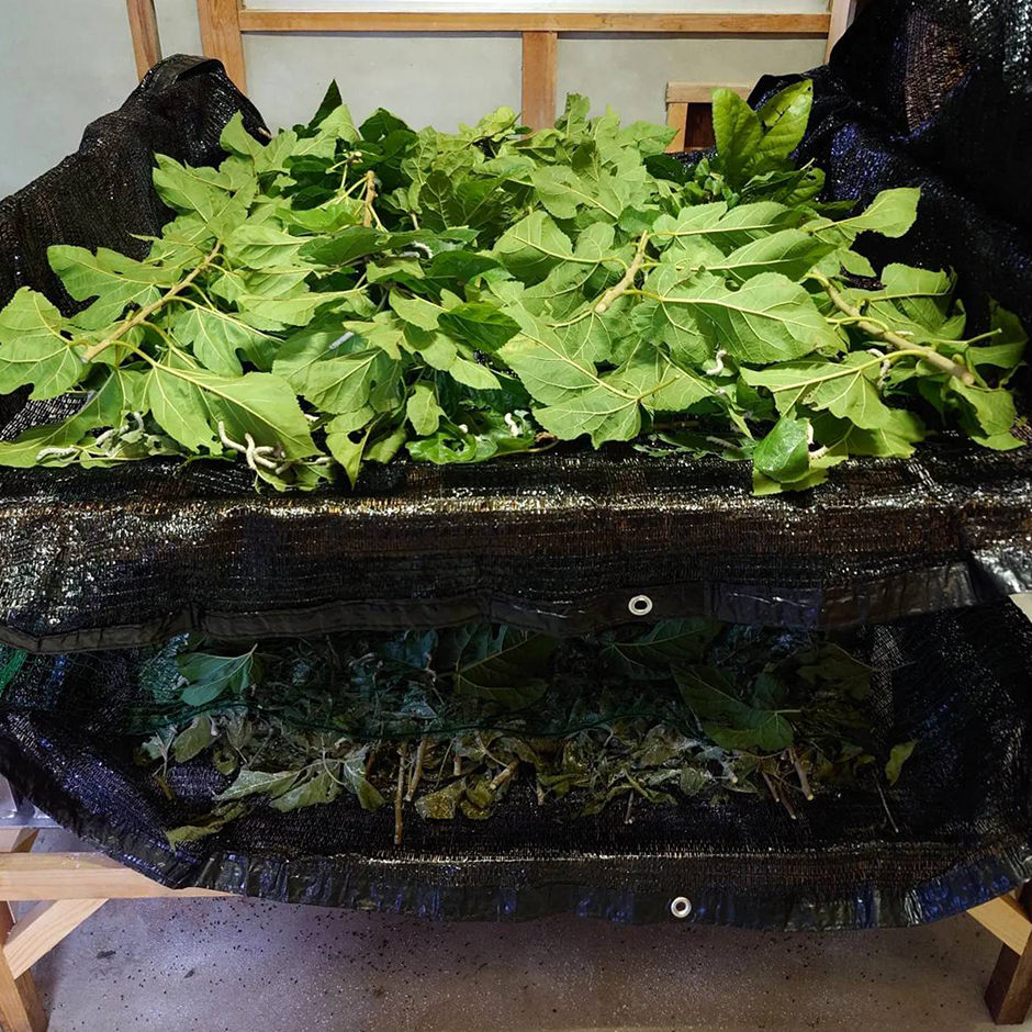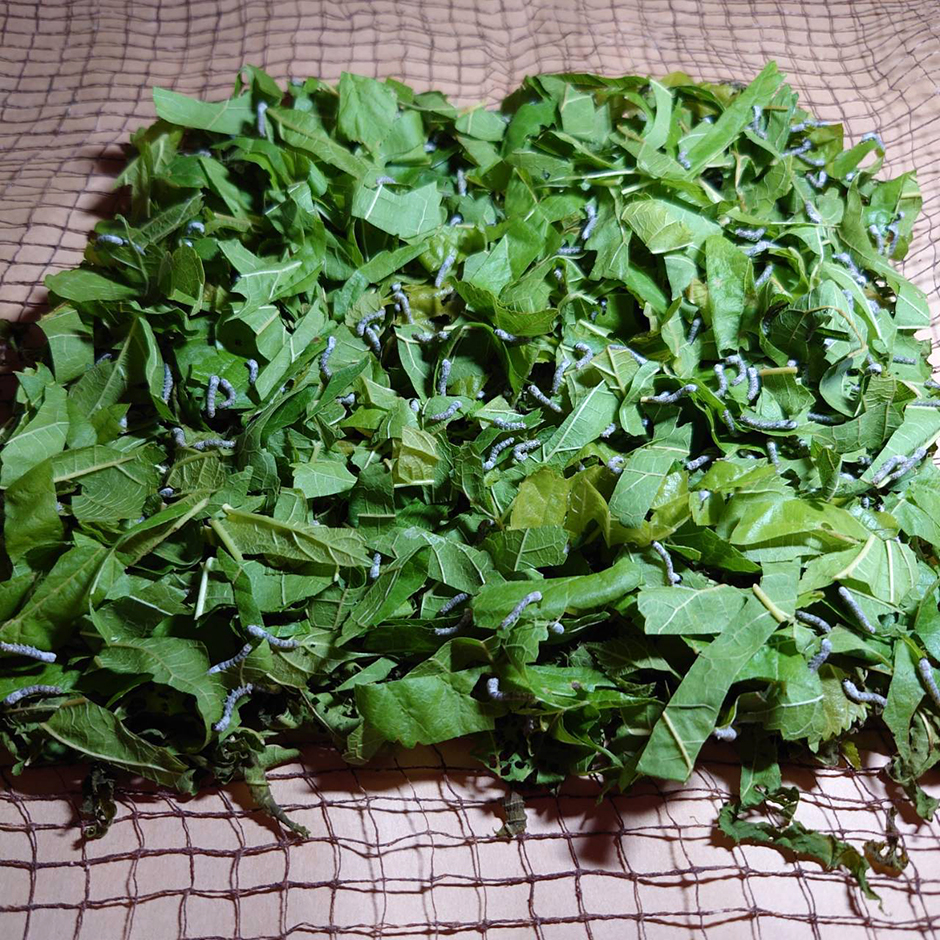 ▼ その後、網をかけ、さらに「拡座」して「給桑」。与える桑の量が最初の6倍になった。とても順調に育っている。
