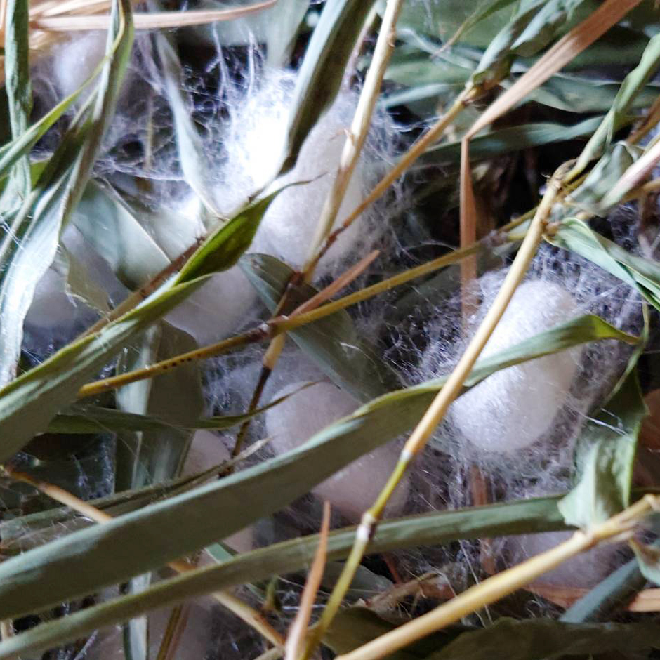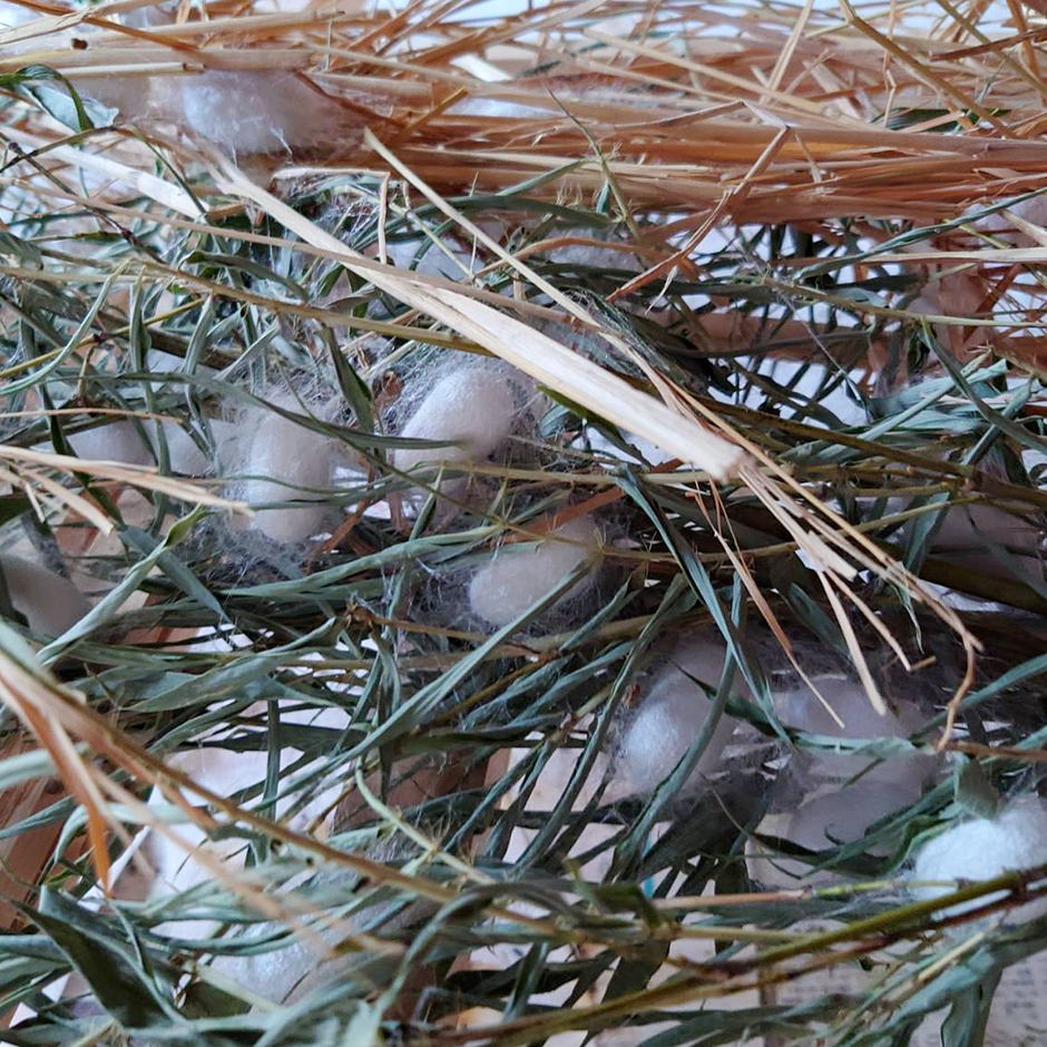 ▼ 32日目。充分に成熟した蚕が繭を作るための足場(蔟(まぶし))を入れてから6日目。ほとんどすべての蚕が繭を作った。