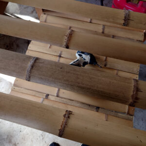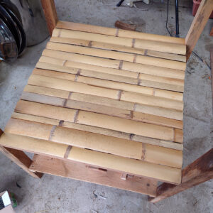 ところが、棚板に使えそうな板が足りません。仕方なく、一段目は隙間を開けたスノコ式。二段目は藪から切り出した竹を並べてみました。それでも足らず、三段目も隙間だらけ。それでも不思議なもので、組み上がるにつれてウキウキしてきます。