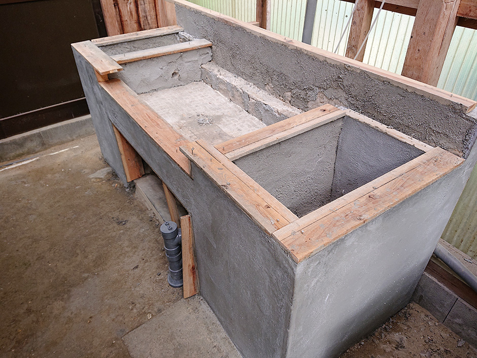 先日、修理した“かまど(『へっついさん(かまどの修理)』)”の隣に、これまた何十年は使われていないボロボロの流し台(シンク)があります。これを使えるように修理すれば、草木染の工房としてとても役立てたいと思い、プロにお願いして修復を始めました。