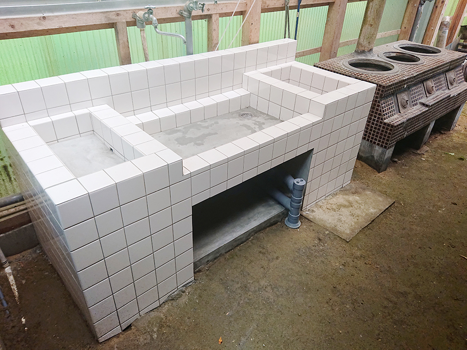 先日来、プロに修理を依頼していた流し台(シンク)の修復が終わりました。今回は、そのビフォー& アフターです。古いかまどと流し台を修理を終え、ほんと!草木染の工房らしくなってきましたよ😀
