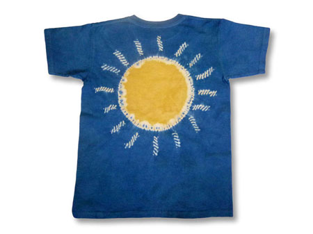 そして、もっとも苦労したのが、この太陽の柄です。いったんTシャツ全体をタマネギで黄色に染め、下絵を描いてから絞り染めを施し、さらに藍で染めたものです。夏のギラギラとした太陽を表現したくて、本当に苦労しましたが、タマネギの黄色といい、藍の青さといい、やっと少し納得いくものになりました。