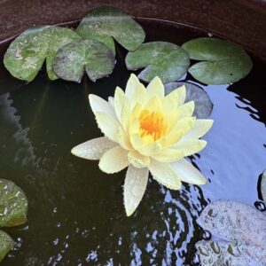ひとつ屋の古民家工房(三重県伊賀市)の玄関わきに数年前から睡蓮鉢があります。その中には数匹のメダカと一鉢の睡蓮。たいして世話をしているわけではないのですが、今年も涼し気な花を咲かせてくれました。
