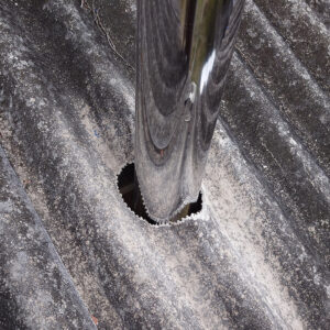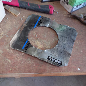 前回までに、煙突は大波スレートの屋根を貫通して屋外まで出ています。ただ、屋根と煙突のあいだには隙間があり、このままでは雨が入ってしまいます。とはいえ、専用品をそろえれば簡単ですが、できるだけお金はかけたくありません(いや! お金がありません—😭)。