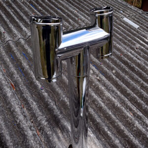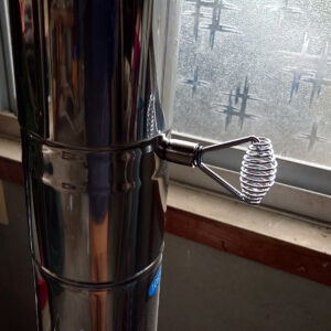 まずは屋根に上がる前に、煙突の途中にダンパー(薪ストーブの煙突内に設置され、煙の流れを調整するための弁)を取り付け、全体の高さを最終調整します。